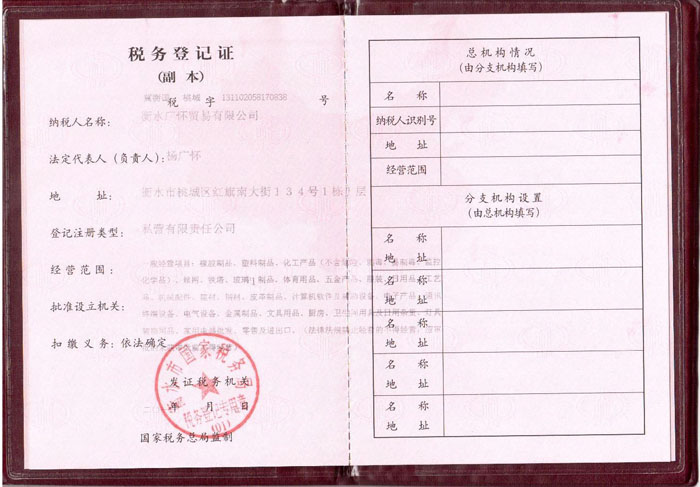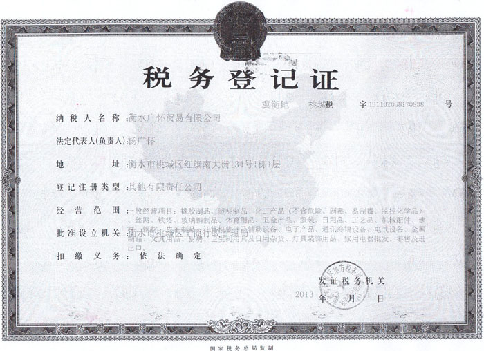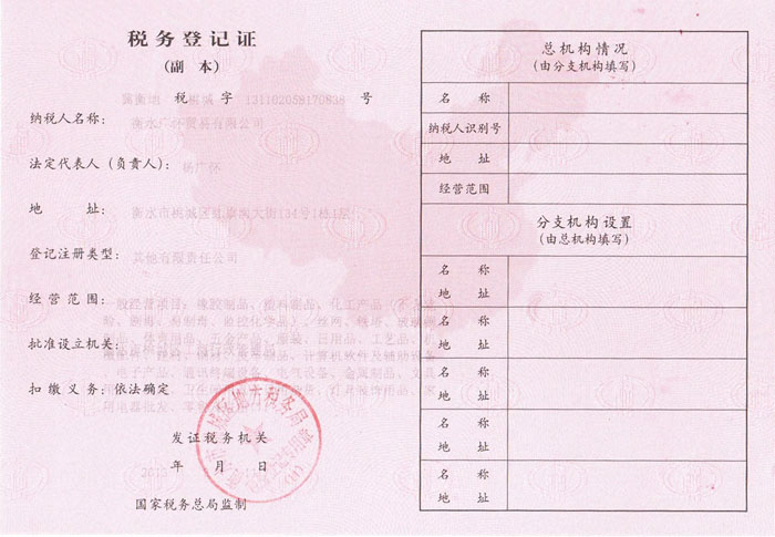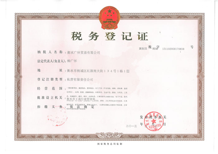 衡水广怀贸易有限公司税务登记证国税(正本)