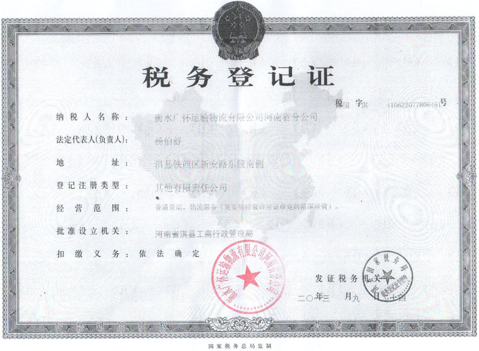 衡水广怀运输物流有限公司河南省分公司税务登记证
