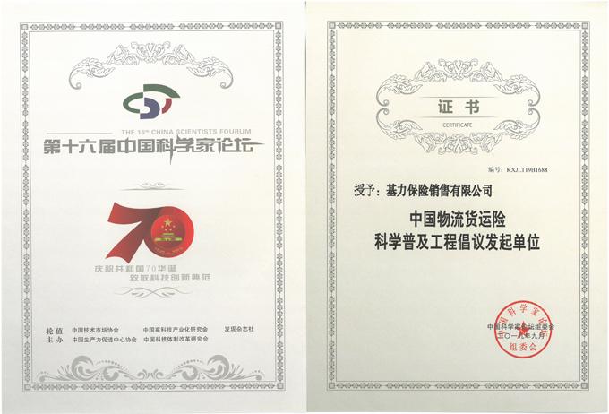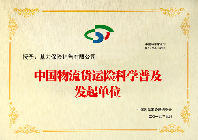 中国物流货运险科学普及工程倡议发起单位-铜牌